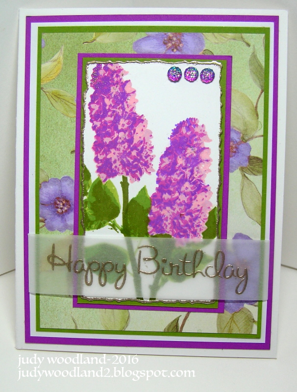 I used an awesome mult step stamp set called Muli Step Lilacs here. It comes out beautifully and different color combinations can be used for different effects. With Versamark, I dipped the edges of the white card stock on which I had stamped the flowers, and then sprinkled on liquid platinum embossing powder and heat set it. It gives a pretty gilded edge that I love.